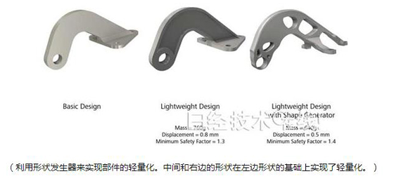 形状发生器功能可将现有部件的形状数据等作为初始形状,通过去掉应力较小的部分等方法,在确保强度等的情况下实现部件的轻量化。用户可指定安装孔的位置等不需要更改的部分,以及与邻近部件的边界等不能超出界限的部分,还能进一步定义对部件施加的负载。用户指定部件的轻量化比例等目标值之后,软件会自动生成符合条件的形状。