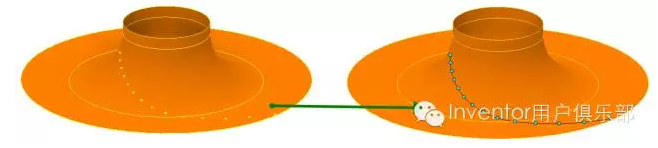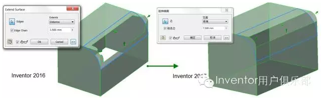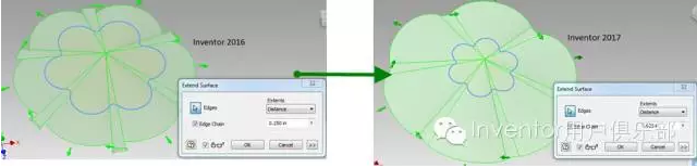 图1所示是在Inventor 2016中延展的面距离较小并且延展出的边界不连续,但在Inventor 2017中可以获得较大距离的延展面并且延展出的边界比较连续和光顺。