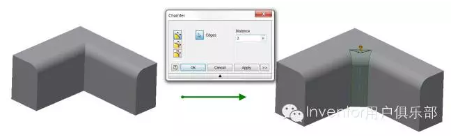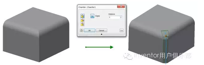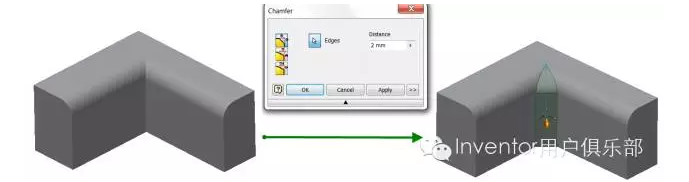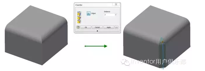在Inventor 2017中,倒角将在与圆角的相交处继续采用偏移的方式产生结果,如图9和图10所示。