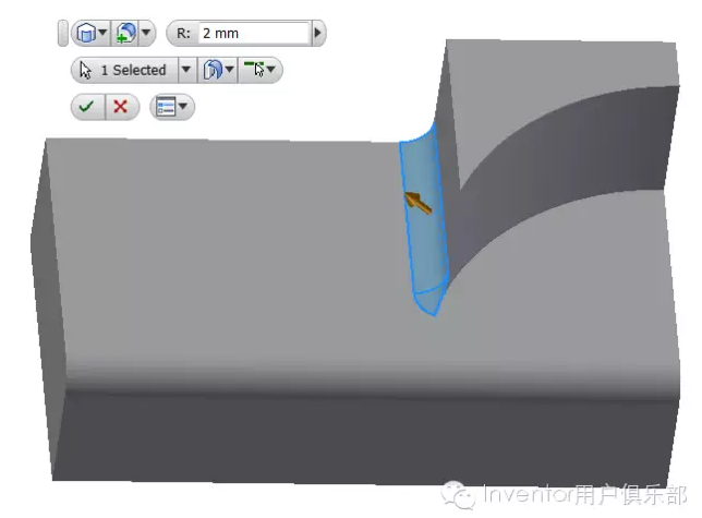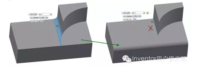 如图11所示,在Inventor 2016中,当参考边(图中箭头所指处)添加了圆角后,再在侧面添加圆角时会在一端与已经存在的圆角进行标准的求交运算时报错(侧面圆角与参考边圆角会有交叉)。