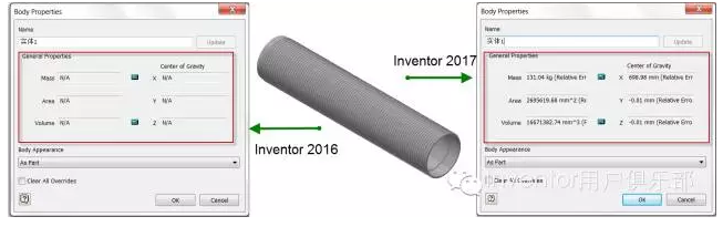 部分用户反映在零件中添加螺旋扫描特征或一周圆形的退刀槽后会出现质量等属性不可计算的情况。ASM在Inventor 2016的SP和Inventor 2017中修复了这个问题,这样在零件中添加螺旋扫描特征或圆周形退刀槽后质量等属性就能正确的计算和显示,如图13所示。