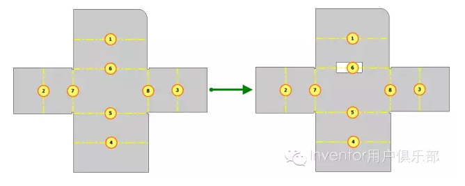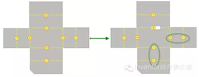在Inventor 2016中,进入零件的展开模式下,显示折弯顺序标注号如图15(左)所示。回到折叠零件中,展开此钣金件,添加钣金特征(比如添加剪切特征),重新折叠此钣金件,然后再转至展开模式,显示折弯顺序标注号如图15(右)所示,可见其和前面的折弯顺序号已经不一致了。