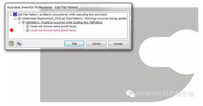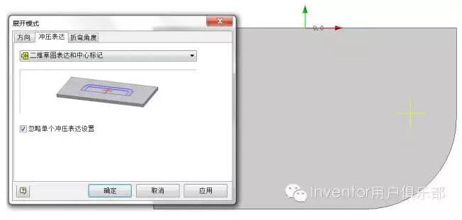 对于开口的钣金冲压,在Inventor 2016及以前版本中,当在展开模式的冲压表达中选择二维草图表达、二维草图表达和中心标记或仅中心标记时程序会报错,如图17所示。