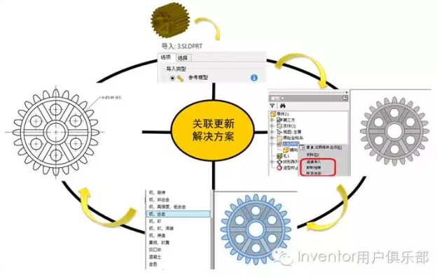 (1)导入类型;参考模型和转换类型。其中参考模型则是本文中关联系统更新的导入类型,至于转换类型,与较早版本的Inventor大同小异,限于篇幅,不再赘述。
