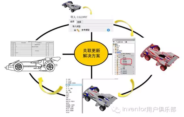 ,用户只需要进行模型更行,文件将会自动重新导入,与此同时,用户在Inventor中所创建的下游设计数据也一并更新。