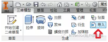 (3)零件中导入:启动Inventor,新建或打开零件文件,通过“三维模型”,“创建”,“导入” 命令或“管理”,“插入”,“导入”命令来导入一个或多个第三方格式文件。图3.3,3.4。
