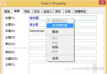 第三方数据导入到在装配后,源文件的属性会一并加载进来,但是,不排除某些属性不准确,不合理,因此在生成BOM表和Partlist时,难免某些属性不够准确。因此,通过装配体的文件属性即iProperty的修改,也就是属性覆盖来完成。当然,属性覆盖后,可以通过“来自源的值”菜单把源属性重新导入。